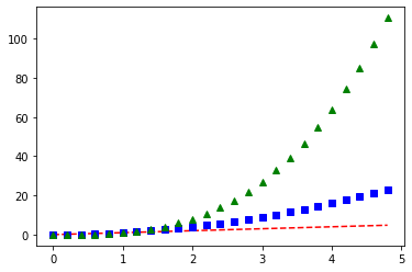 plt.plot(t, t, 'r--', t, t**2, 'bs', t, t**3, 'g^')