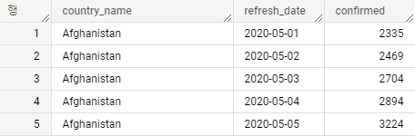 LAST_VALUE(confirmed) OVER (PARTITION BY country_name ORDER BY confirmed ROWS